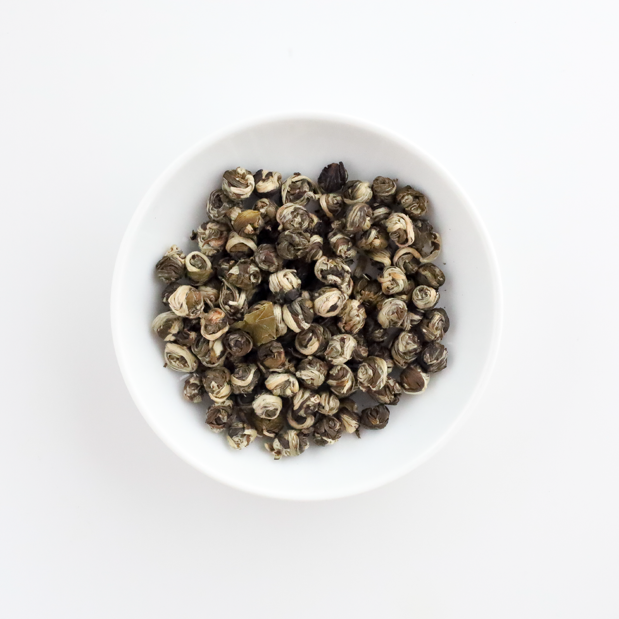 Limited production, top quality jasmine tea from Fujian. Long leaf tips, hand picked and scented with freshly cut jasmine blossoms and rolled into small pearls. 100g box.